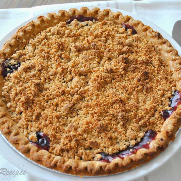 Blueberry crumble pie is a favorite in our family. When I came across a recipe in Bon Appรฉtit magazine from 2011, I remembered that the pie crust was too labor-intensive.ย So, I decided to create my own easier version of this blueberry crumble pie!