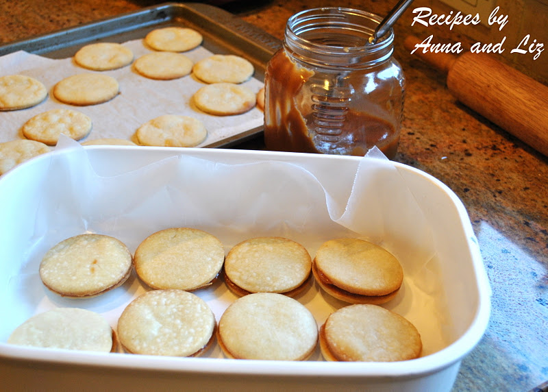 Finally, take two baked shortbread cookies and sandwich them together with a heaping teaspoon of Dulce de Leche cream.
