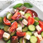 Our Favorite Greek Salad is an easy recipe made with five fresh ingredients and tossed in a tangy vinaigrette. It’s our all-time favorite Greek salad! We’re preparing it as authentically as possible, just like they serve it in Greece, with cubes of feta cheese, fresh tomatoes, cucumbers, and mint. Simple, easy, and delightfully delicious!