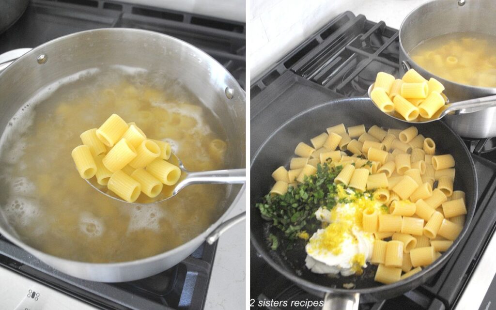 5. Toss the mezzi rigatoni pasta in the boiling water and cook until the pasta is al dente, and slightly undercooked by 1 minute. When the pasta is ready, turn off the heat. NOTE: Instead of draining the pasta, we will bring it over to the skillet one scoop at a time.