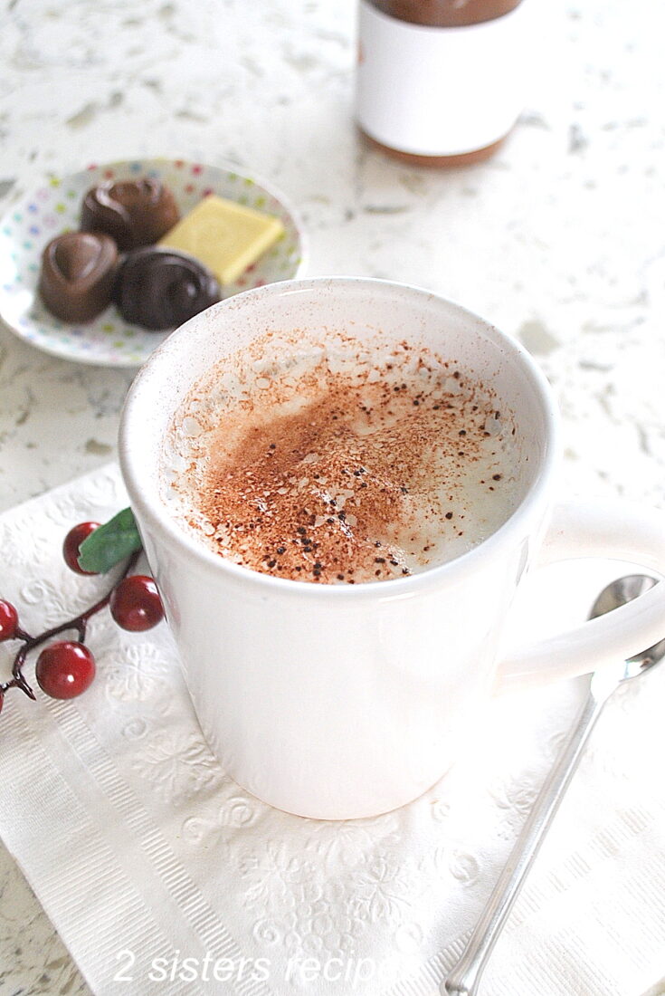 4. FINAL STEP: Add a heaping teaspoon of Nutella spread into a coffee mug. Pour the frothy milk into the mug. Add one shot, or two shots of espresso coffee. Top with a light dusting of cocoa powder. Then give it a quick stir with a teaspoon and enjoy!