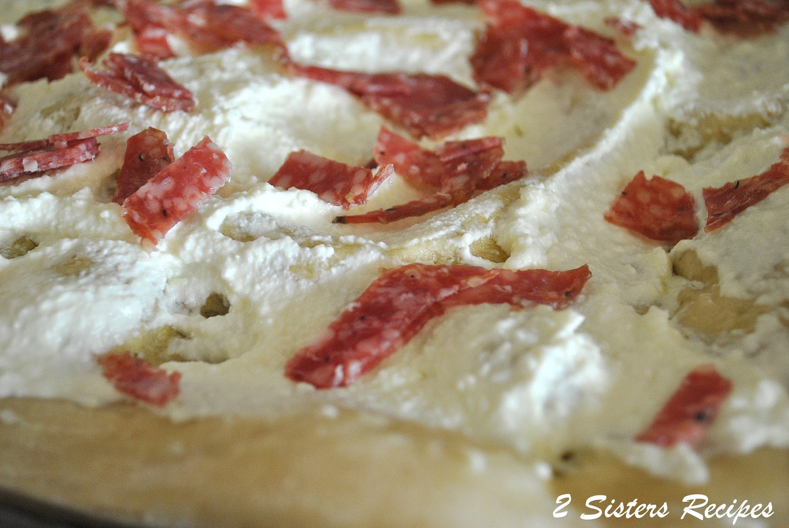 Spread an even layer of ricotta cheese onto dough. Scatter parmigiano cheese and salami pieces.