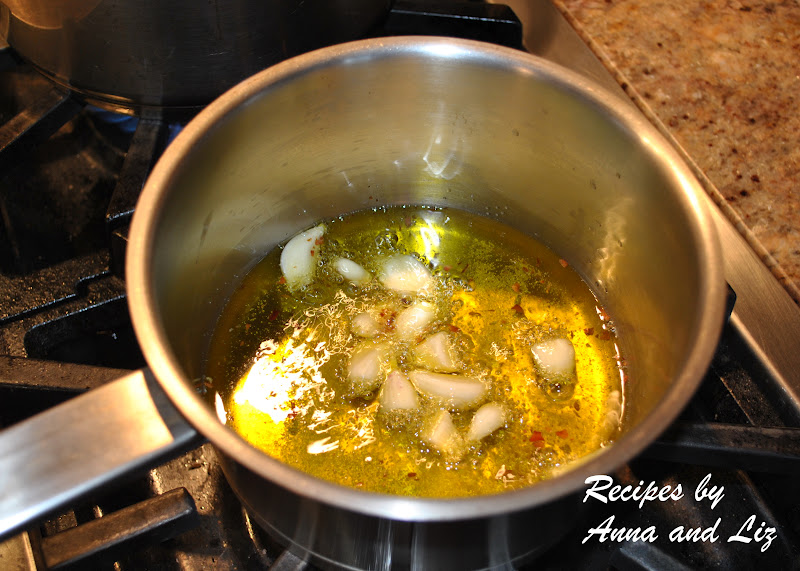 - In the meantime, in a small quart size pot, and on low heat, pour 1/2 cup of olive oil. Gently heat and add garlic, 1/4 teaspoon of sea salt, and red pepper flakes. Simmer for 1 to 2 minutes, until garlic is golden, but not brown.