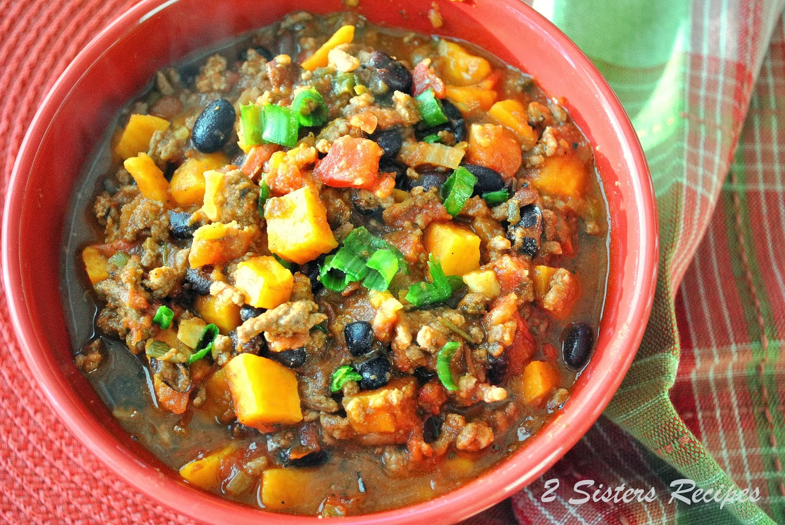 Sweet potato chili can be made with ground chicken, veal, pork, or beef.