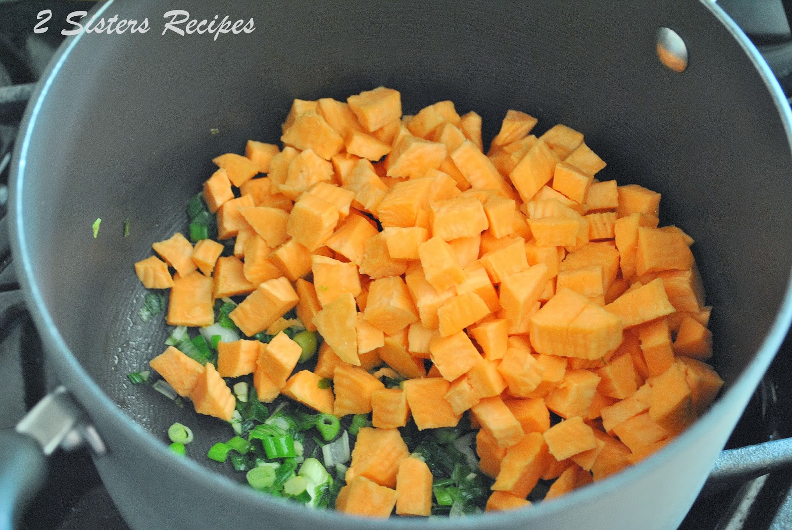 - Add the green onions and garlic. Sauté them for two minutes. Stir in the sweet potatoes and cook for about 2 minutes.